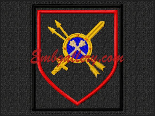 Дизайн машинной вышивки "Нарукавный знак"_K708 85x100mm (+ строчка для вырезания); St:7612; Clrs:7/7; В архиве форматы: PES, JEF, HUS, DST, VIP, VP3, EXP